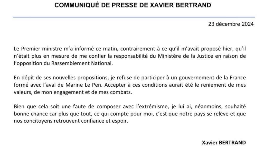 Une dimension à éclairer aussi par ce communiqué de Xavier Bertrand, qui n’aura finalement pas reçu le maroquin qu’il convoitait (le ministère de la Justice) dans le gouvernement Bayrou, et qui dénonce « un gouvernement de la France formé avec l’aval de Marine Le Pen ». Une accusation déjà largement portée contre le gouvernement de Michel Barnier.