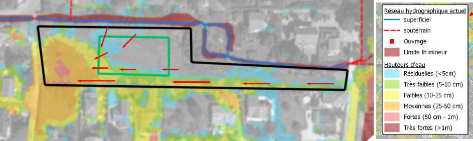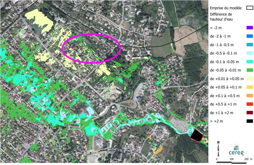 La carte liée à l’étude hydraulique en cas de crue trentennale montre ceci (j’ai ajouté l’ellipse en violet pour indiquer l’emplacement du terrain de Lucie Croissant) :