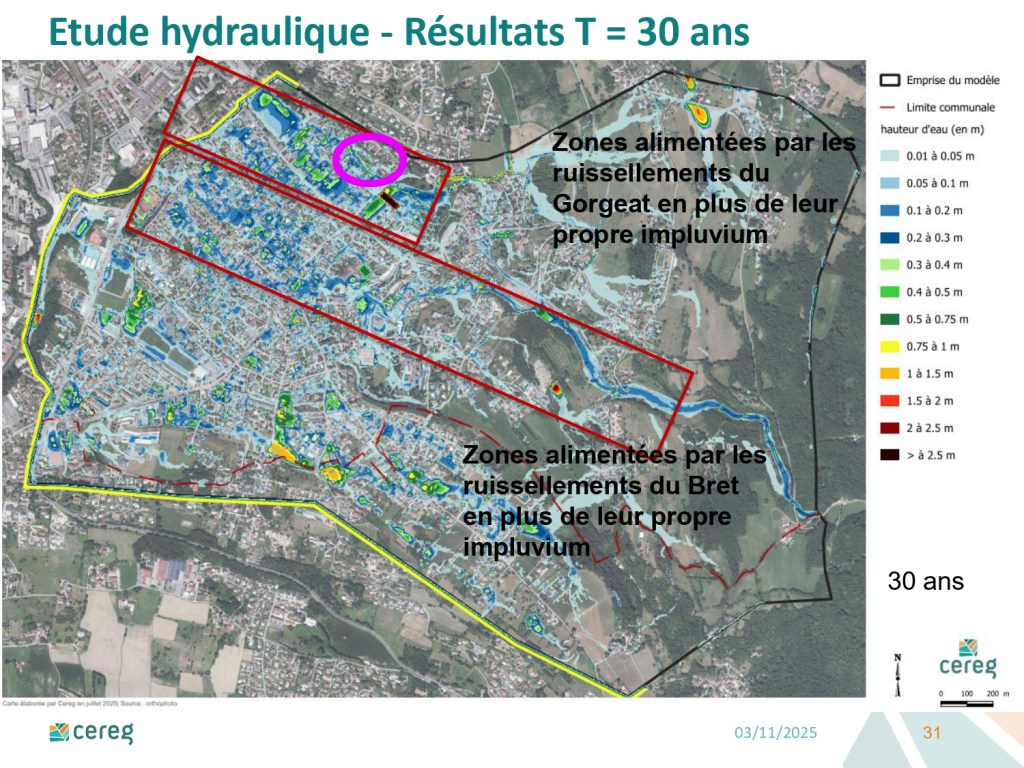 La carte des aléas « sera probablement à réviser à l’issue des travaux sur le cours du ruisseau Gorgeat lui-même et après réalisation des bassins de rétention (ceux prévus par le Symbhi et ceux prévus par la commune dans le PLU) ». Autrement dit : les aléas seront certainement revus à la baisse à la suite des futurs travaux et de la création de nouveaux bassins de rétention, puisqu’ils auront pour effet de diminuer la quantité d’eau se déversant sur la parcelle en cas de crue.