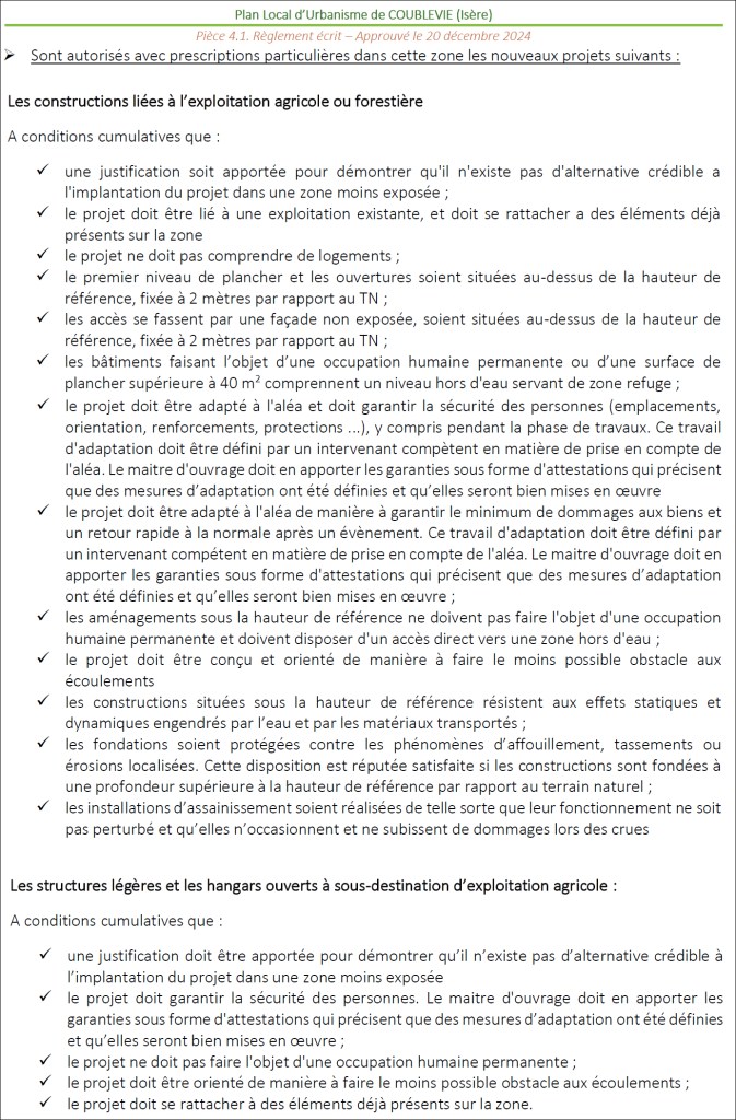 Par ailleurs, si l’on en croit le rapport d’enquête liée à la révision du PLU de Coublevie, la désignation de cette parcelle comme relevant des « aléas forts ou très forts » ne s’explique pas par la crainte d’un « péril pour la vie des personnes » ou d’une « destruction du bâti », mais exclusivement « parce qu’il s’avère nécessaire d’assurer un libre écoulement des eaux sur cette largeur du terrain » :