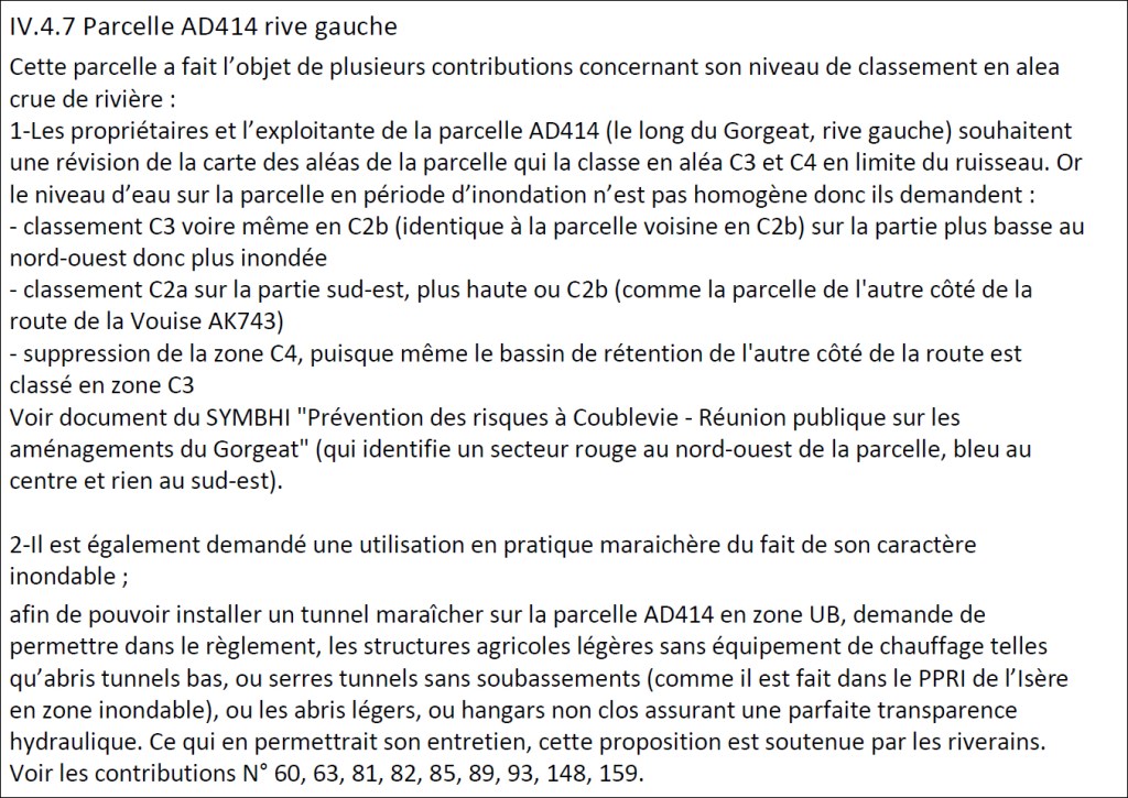 Dans son rapport d’enquête, où elle collecte les observations des citoyen·nes et les réponses de la mairie à celles-ci, la commissaire-enquêtrice évoque également la parcelle AD414 sur la rive gauche du Gorgeat :