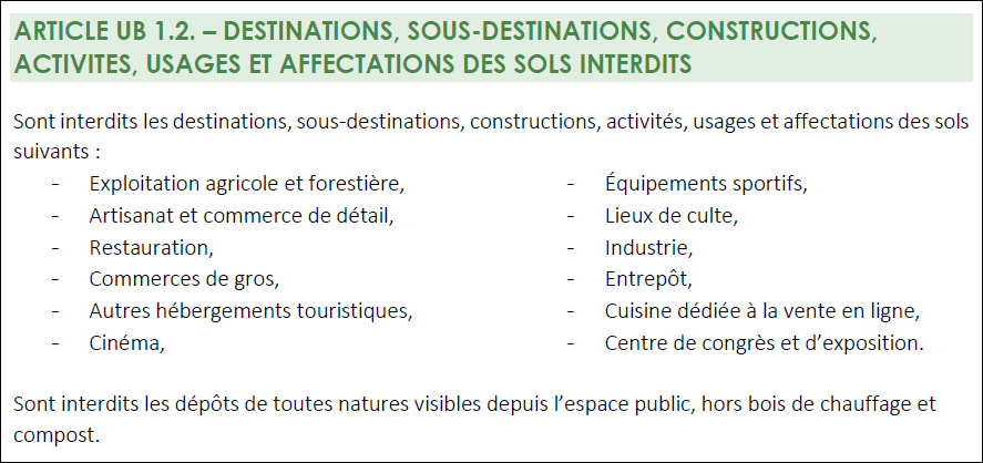 Pourtant, le PLU révisé qui sera finalement adopté indique, pour cette fameuse zone urbaine « Ub » : « Sont interdits les destinations, sous-destinations, constructions, activités, usages et affectations des sols suivants : Exploitation agricole et forestière ».