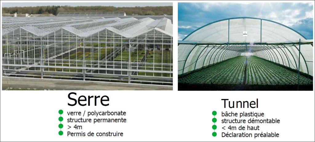 Avant de signer le bail, Lucie Croissant a pris contact avec la Chambre d’agriculture de l’Isère et un avocat pour vérifier qu’il sera bien possible d’y installer son tunnel. On parle en effet ici de « tunnel » (ou de « serre-tunnel ») et non de « serre » : si la serre dispose de parois en verre ou polycarbonate, d’une structure permanente et d’une hauteur importante, le tunnel, lui, se contente d’une bâche en plastique, de montants démontables (arceaux métalliques ou en PVC) et d’une hauteur plus faible (moins de quatre mètres). Typiquement, la serre nécessite un permis de construire, tandis que le tunnel se limite à une déclaration préalable (DP) de travaux.